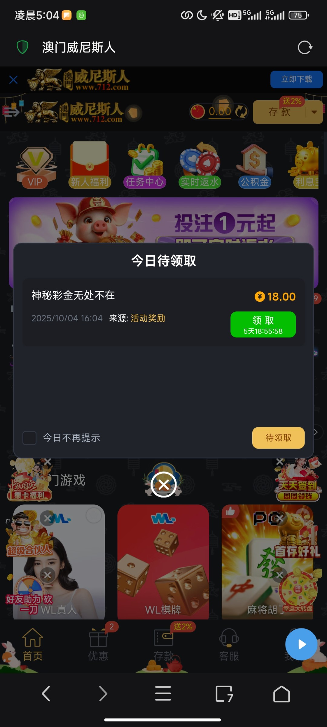 登录送了18神秘彩金。没有充值过,网站712.com