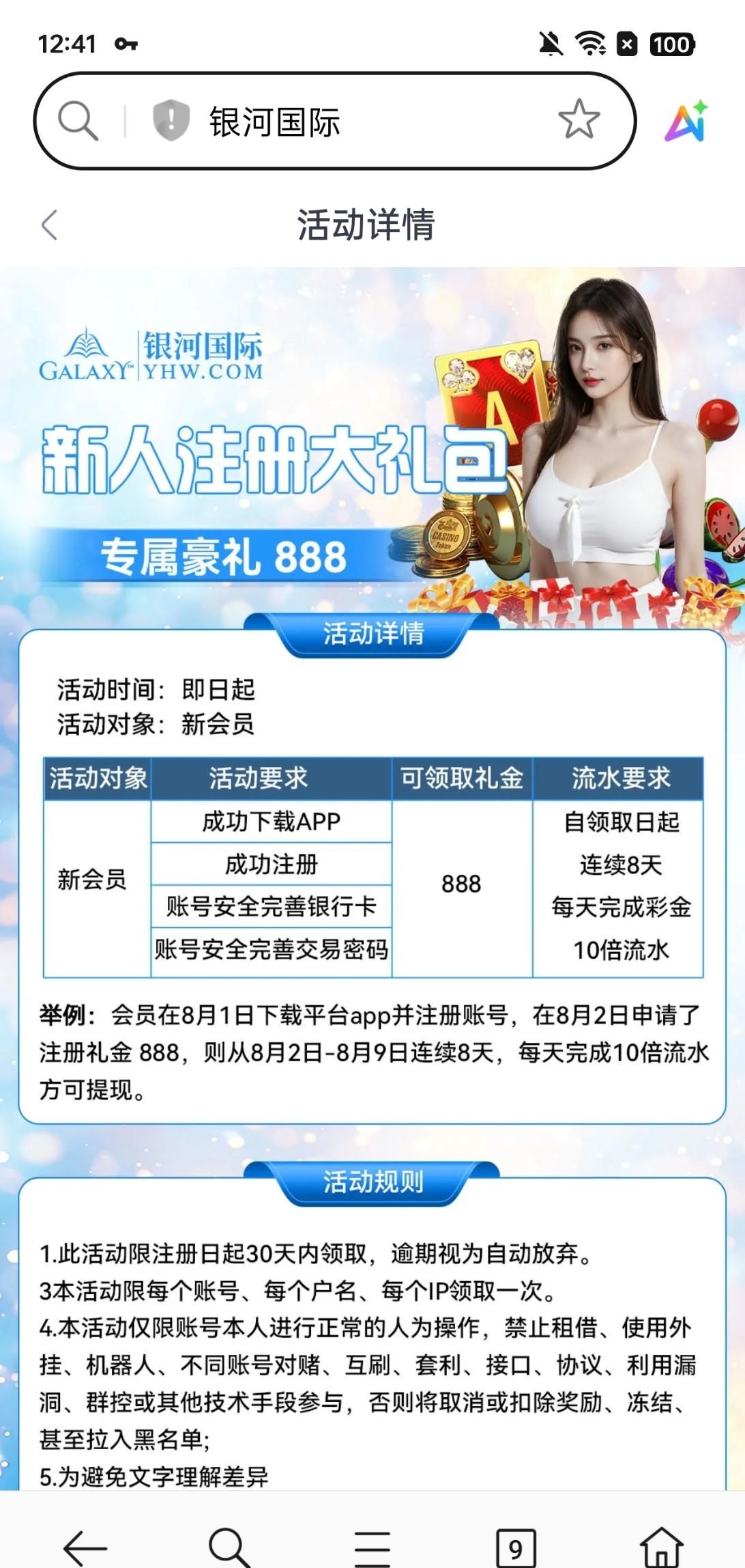 注册绑定银行卡以后日常活动领取,绑定了就能领取,必送的!888彩金需要完成8880流水才能提现,当天完成了8880流水第二天还能送888,禁止充值