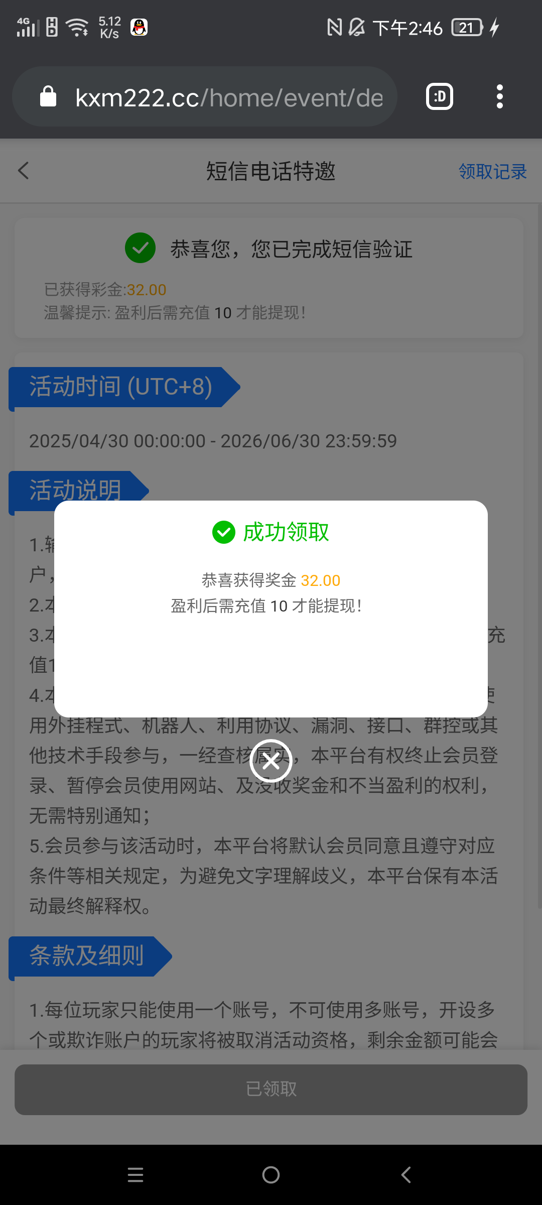 新用户注册绑卡,优惠中心自助手机号领取32,十倍流水,活动要求达到要求,好像要充10块钱,才可以提现,自行测试