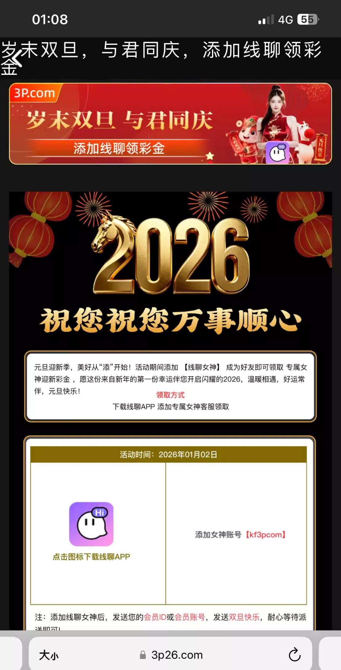 3p棋牌元旦添加线聊女神送元旦彩金,我送了38前几年充值玩过了,网址3p26.com 线聊下载链接https://xianliao.app